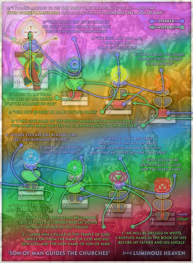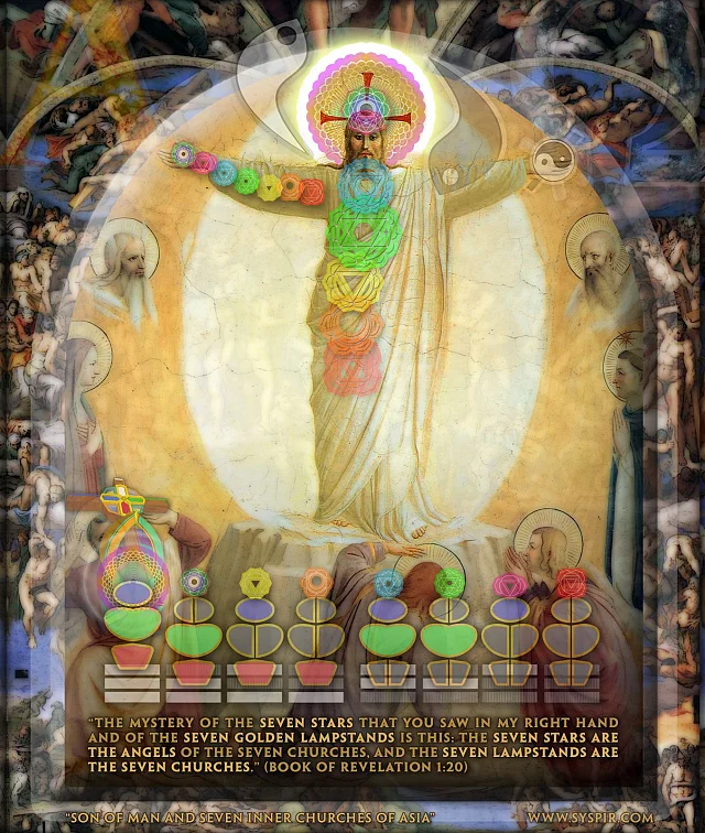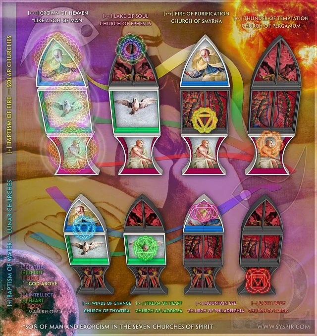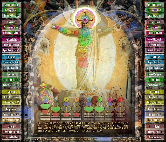 The last three of the seven inner churches (in chapter three) have been re-ordered for ease of sequential reading from βΊβΊβΊ Heaven to β»β»β» Earth. This is a short illustrated journey into the stars of the churches, although much remains to be said. Suffice it to say that every good child of luminosity should diligently attend the seven churches daily!